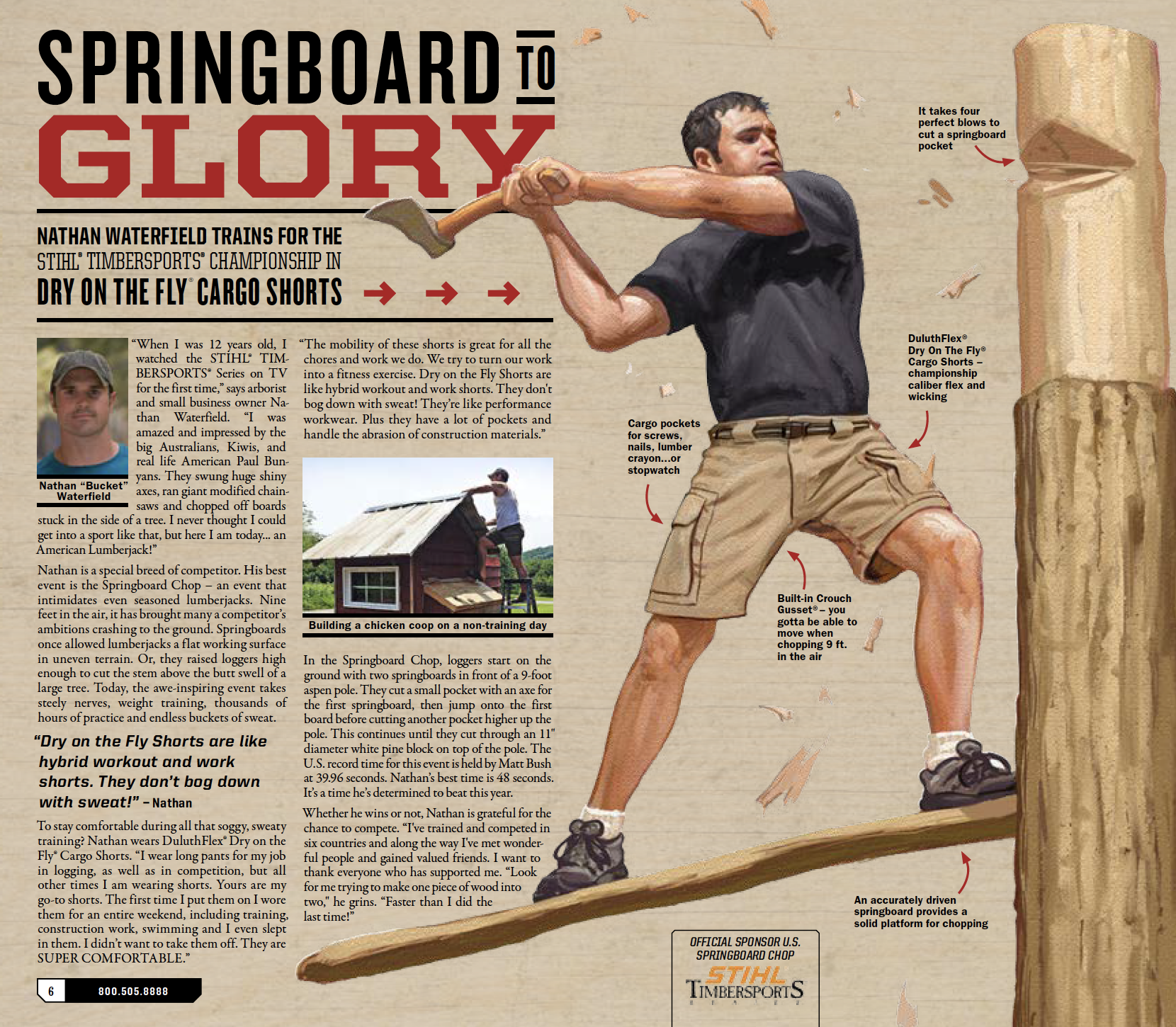 Duluth Trading outfitted the loggers who competed in the annual STIHL Timbersports® Championship on ESPN. Nate also wore Duluth gear while training for one of the hardest and most dangerous events.