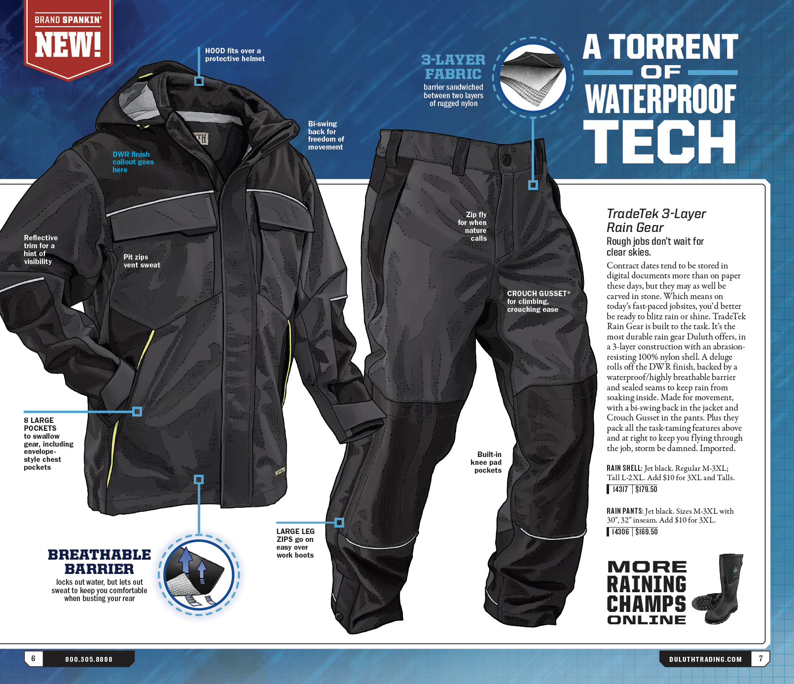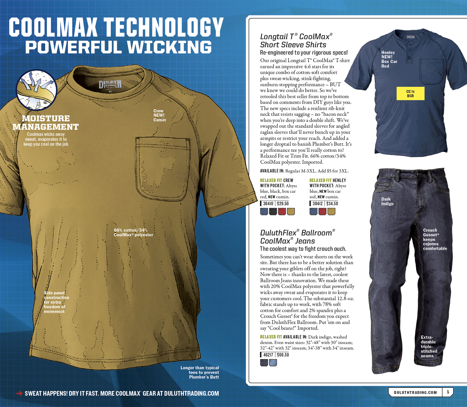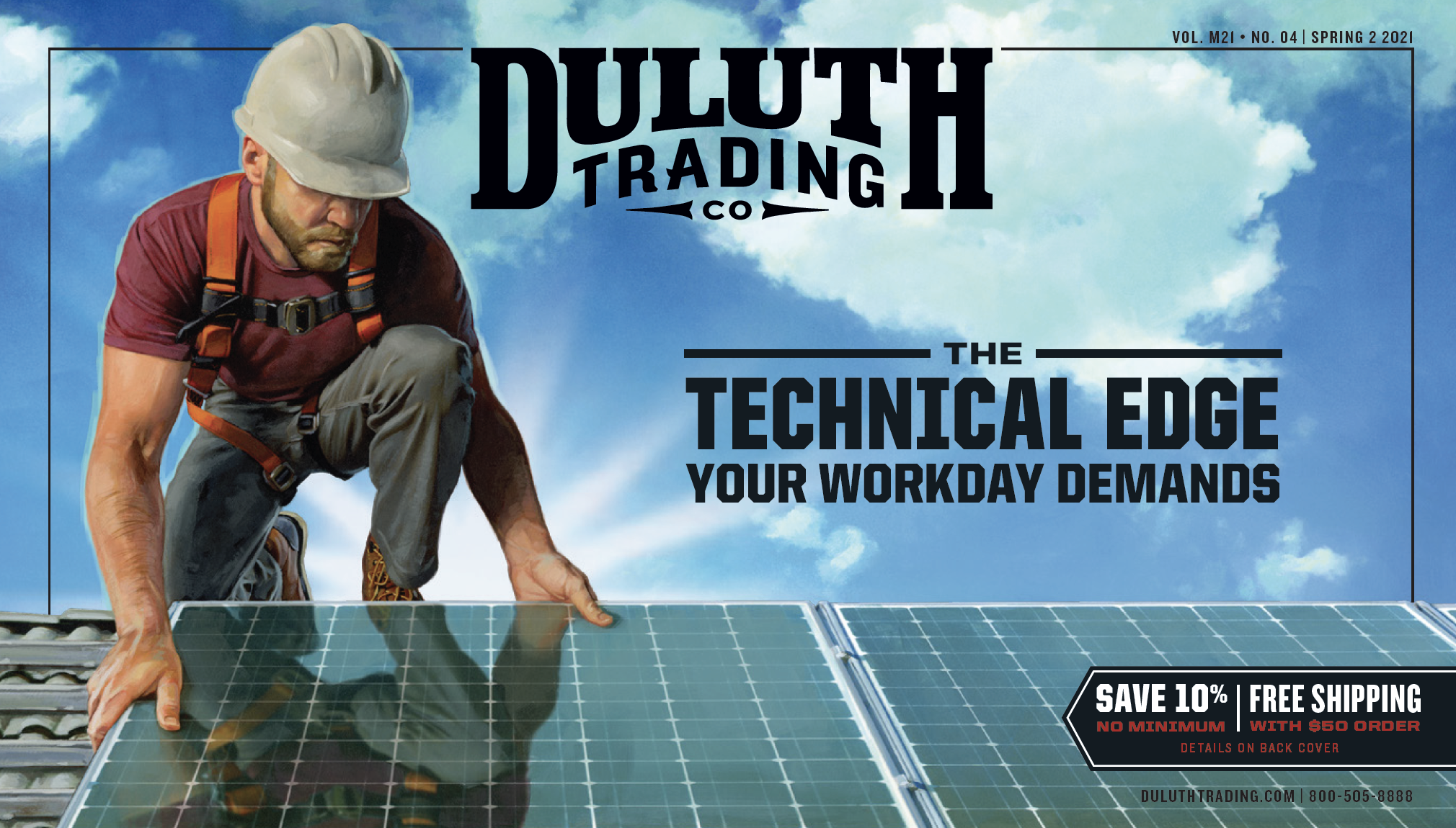 A focus on the technical details built into Duluth Trading workwear. Cover art leans in to green.